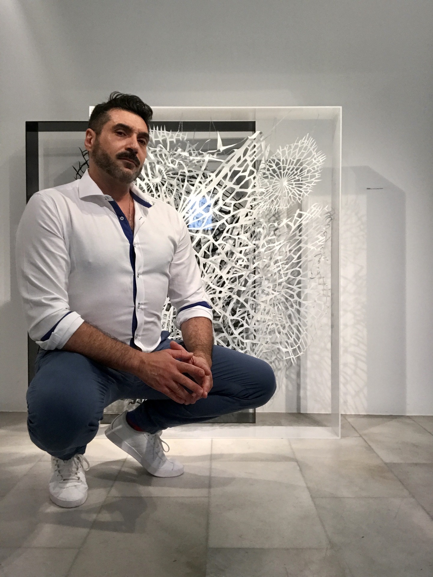 ------> απ: Η πρώτη μου ατομική έκθεση, «χ [ΚΟΙΝΩΝΙΑ]», έγινε το 2020 στη Gallery Genesis. Η ιδέα της ξεκίνησε από τη μελέτη του φυτού νούφαρου. Παρατηρώντας τη δομή των νεύρων του φύλλου του, είδα ένα φυσικό δίκτυο επικοινωνίας, ένα ζωντανό σύστημα μεταφοράς ενέργειας και φωτός. Απομόνωσα αυτό το μοτίβο και, χρησιμοποιώντας ριζόχαρτο, το έκοψα με κοπίδι για να φτιάξω τις πρώτες μορφές πλέγματος. Το ριζόχαρτο το διάλεξα γιατί είναι διάφανο και αφήνει το φως να περνά – κι έτσι το ίδιο το φως έγινε μέρος του έργου. Για να τα στεγάσω, δημιούργησα τα δικά μου φωτεινά κουτιά από πλεξιγκλάς, με φως LED πίσω τους, ώστε να ζωντανεύουν οι διαφάνειες και να δονείται ο χώρος από μέσα προς τα έξω.Μέσα από αυτή τη διαδικασία γεννήθηκε κάτι που παραμένει βασικό και σήμερα: Το μοτίβο της δομής των νεύρων του φύλλου του νούφαρου έγινε το προσωπικό μου μέσο επικοινωνίας. Με τα χρόνια, έγινε κάτι πολύ περισσότερο από εικαστικό στοιχείο, είναι η υπογραφή ζωής που φέρουν τα έργα μου. Μια μυστική γλώσσα επικοινωνίας, που ενώνει όλα όσα δημιουργώ, που διατρέχει το φως, το χαρτί και τις μορφές.Από τότε επανέρχεται σε όλα τα έργα μου, άλλοτε εμφανώς και άλλοτε υπόγεια, σαν σταθερό σημείο αναφοράς, ένα «νευρικό σύστημα» που μεταφέρει φως, συναίσθημα και ζωή. Το χρησιμοποιώ και στα «Έμφυτα Οράματα», στα πιο πρόσφατα ζωγραφικά μου έργα, πάνω στα σώματα ή στον χώρο, σαν έναν αόρατο ιστό που συνδέει τα πάντα: Τον άνθρωπο, τη φύση και το πνεύμα.Για μένα η σχέση με την κοινωνία δεν είναι κάτι έξω από μένα, είναι κάτι που κουβαλάω μέσα μου. Μπορεί να δουλεύω μόνος στο εργαστήριο, αλλά αυτό που φτιάχνω έχει πάντα να κάνει με τους άλλους, με την επικοινωνία, τη μνήμη, τη σύνδεση.