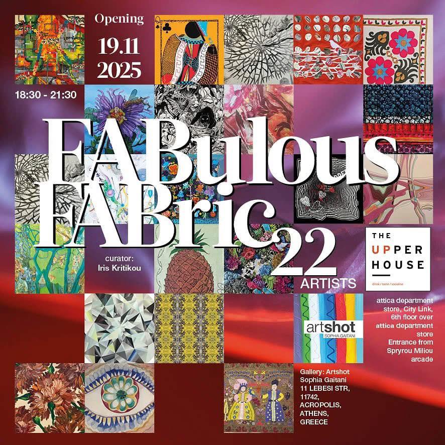 Η ομαδική έκθεση «FABulous FABric» της αίθουσας τέχνηςArtshot - Sophia Gaitani παρουσιάζεται στον υπέροχο art and taste χώρο του The Upper House Athens στο roof του πολυκαταστήματος attica, στις 19 Noεμβρίου 2025.